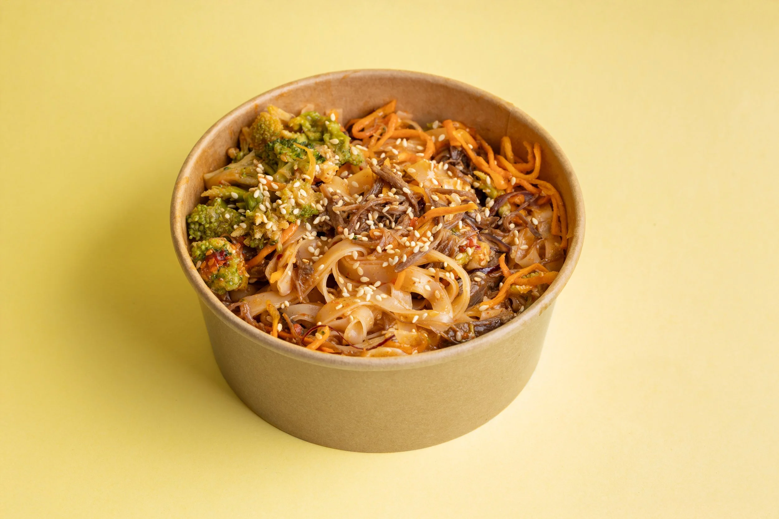 אטריות אורז, בשר מפורק, ברוקולי, גזר, בצל, שום, רוטב צ’ילי, שומשום