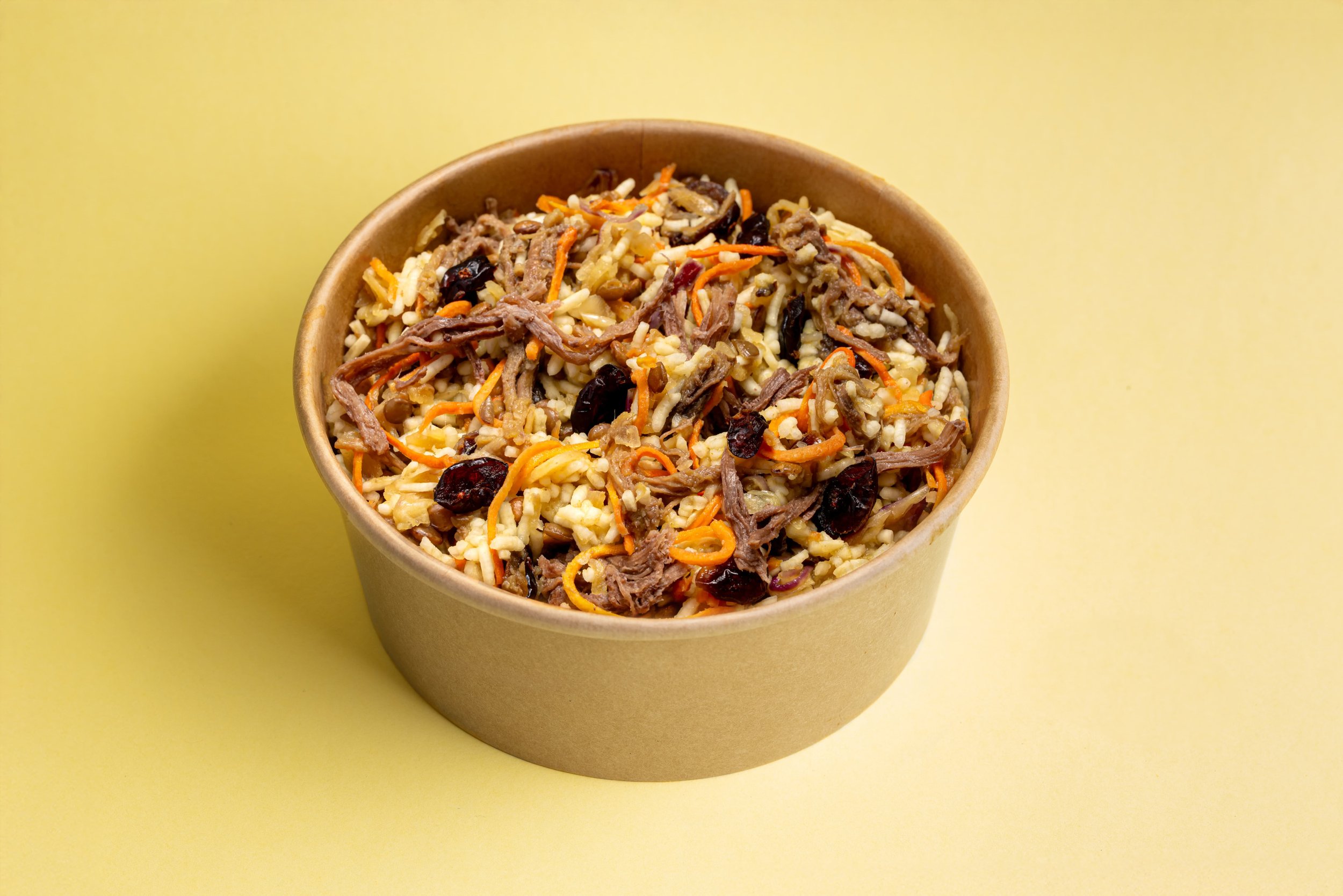 Spiced rice and tender pulled beef, mixed with sweet carrots, red onions, lentils, and tart cranberries